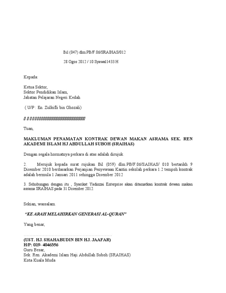 Contoh Surat Penamatan Kontrak Pdf